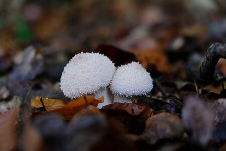 Lycoperdon perlatum, common puffball white mushrooms in forest closeup selective focus