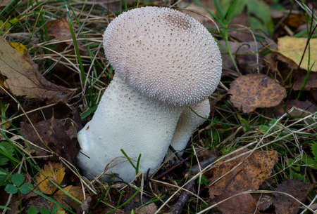 The small mushroom Lycoperdon perlatum grows in the forest substrate. Fungus encountered during autumn mushroom picking.