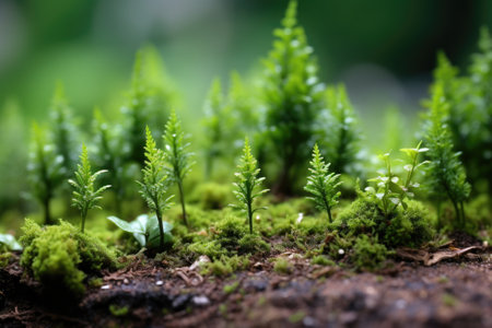 Delicate miniature ferns sprouting from a dense carpet of moss forming a textured trail