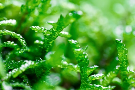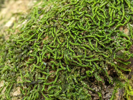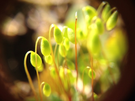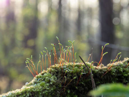 Closeup of moss patch with moss spores over green forest floor background, revival of nature in the spring