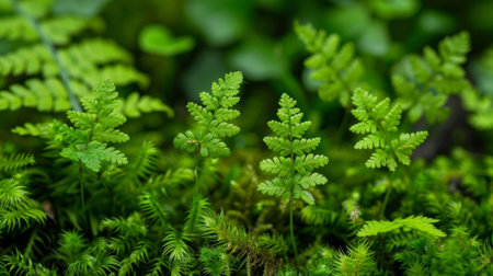 A close-up view of lush green moss, small plants, and delicate fern fronds.