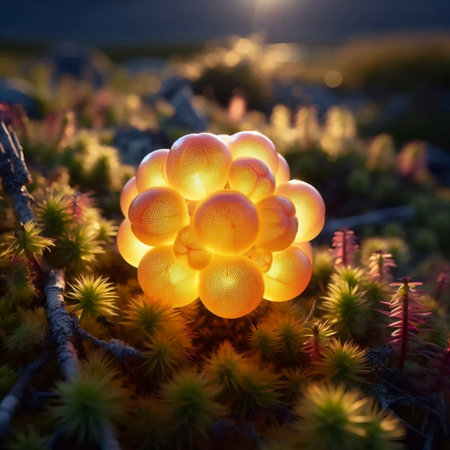 Orange mushroom ,Champagne mushroom or eyelash cup mushroom with sparkling droplets in the forest. Ecosystem or biological diversity concept.