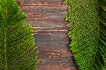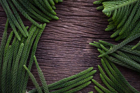 Christmas pine branch on wooden table background