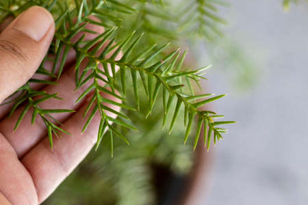 Holding branch of Arucaria colonial pine in hand