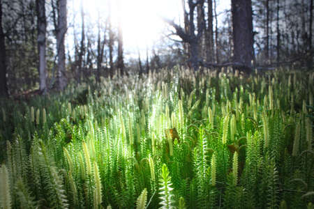 Green forest moss in a sunny day