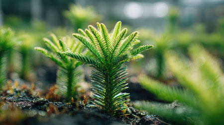 The vibrant green foliage features intricate needle like leaves that catch the light beautifully. This lush growth showcases the delicate details and textures of the plant creating a lively atmosphere