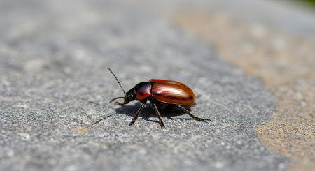 A reddish-brown beetle crawls across a rough grey stone surface under bright sunlight. The macro image reveals the insect's shiny carapace and segmented legs.