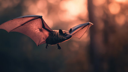 A stunning image of a bat in flight showcasing its detailed wings and graceful movement against a soft twilight background, perfect for wildlife and nature themes.