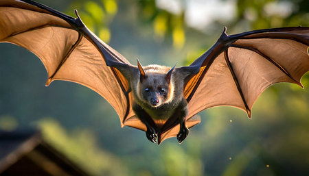 This captivating image showcases a bat soaring gracefully during sunset, surrounded by lush greenery, embodying the harmony of wildlife and nature