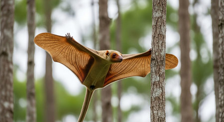 Sunda colugo navigates the twilight sky, showcasing its unique gliding abilities against a softly blurred background filled with gentle hues.