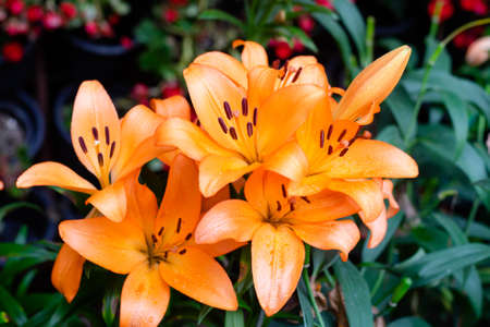 Lily flowers blooming in the garden in the summer. Nature background.