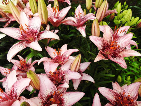 group of fresh pink violet lily flower buds and blooming with green leaves in botany garden natural park