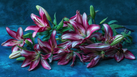 A stunning arrangement of elegant pink lilies is set against a vibrant blue background, capturing the beauty of nature in a serene and artistic way.