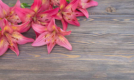 Beautiful pink lily flowers on brown wooden background with copy space for text
