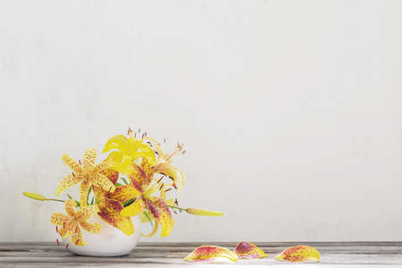 yellow lily in ceramic white vase on wooden table