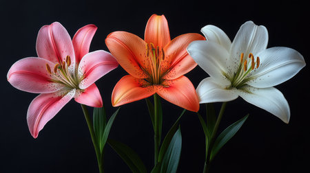 3 lilies, pink and white with orange petals, hyper realistic photography --chaos 30 --ar 16:9 --stylize 750 --v 6.1 Job ID: 832f30d5-814e-4783-b0e4-99ec328fd8e1