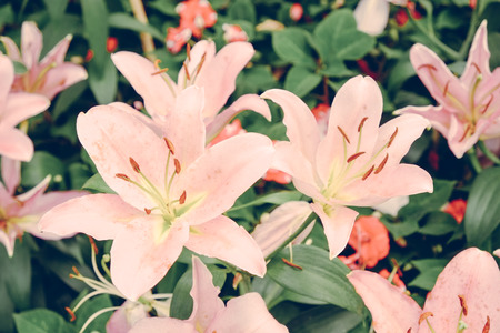 Pink lily flowers in the garden, soft focus and vintage tone