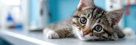 A curious kitten investigates a vet office, showing its playful nature as it explores the surroundings with wide, inquisitive eyes and a playful demeanor.