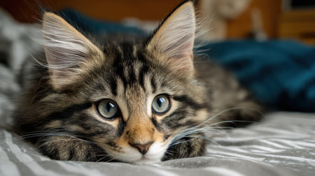 A Maine coon kitten is lying on a soft bed, enjoying a cozy atmosphere in a relaxed domestic environment, with soft blankets around.