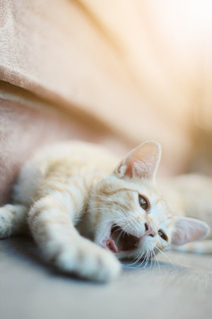 Kitten orange striped cat enjoy and sleep on wooden floor with natural sunlight
