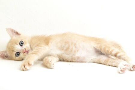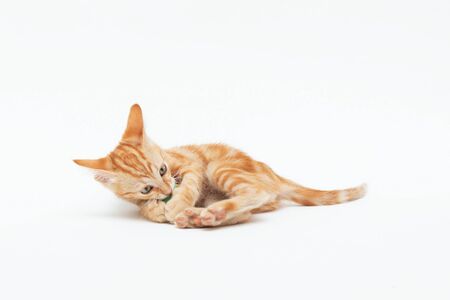 A Beautiful Domestic Orange cat kitten funny positions. Animal portrait isolated on white background.