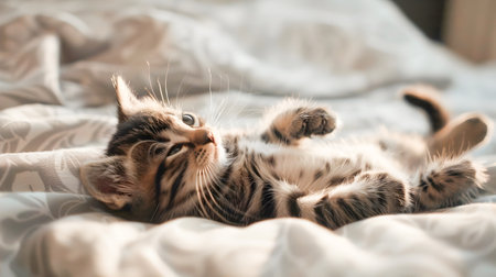 Portrait of cute little small animal pet domestic young kitten cat playing with fun on the bed at home, adorable striped tabby baby paw mammal fluffy feline kitty looking camera with curious eye. Generative AI