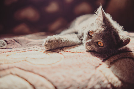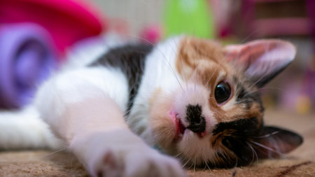 Kitten lies on the carpet in the apartment. Eyes near. Playful pet