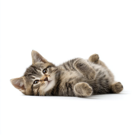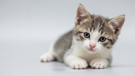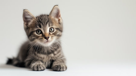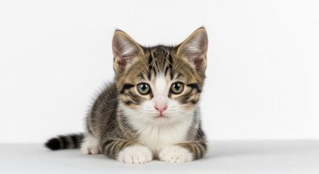 A charming young kitten rests on a smooth white background, displaying its fluffy fur and playful spirit. This delightful image captures the essence of feline innocence.