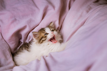 A small colorful kitten lies on the pink bedspread and yawns.
