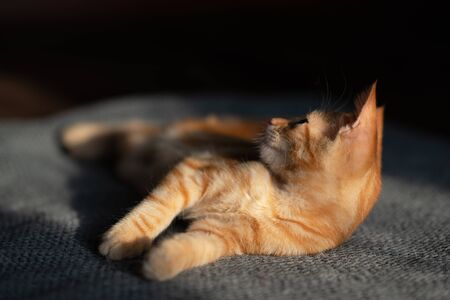 Little funny red kitten sleeps on sofa. Adorable little pet. Cute child animal. Cat rest at home. Self isolation. Stay at home