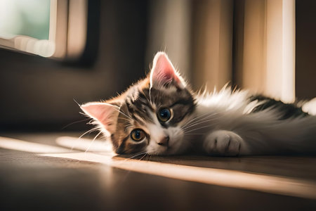 A charming tabby cat lies lazily on a soft surface, bathed in warm sunlight filtering through sheer curtains, creating a peaceful and cozy indoor atmosphere.