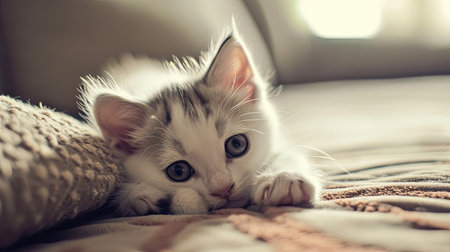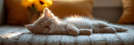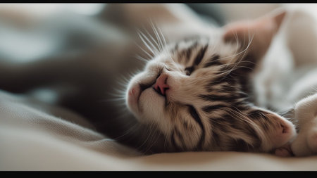 Cute kitten resting peacefully on a soft plush mattress in a calm serene home setting The young feline appears comfortable and content curled up and napping in a state of tranquil relaxation