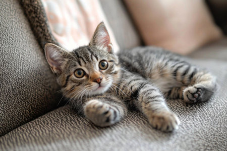 A curious tabby kitten lounges comfortably on a textured couch adorned with decorative pillows. Soft sunlight filters in, highlighting its playful demeanor and striking fur pattern.