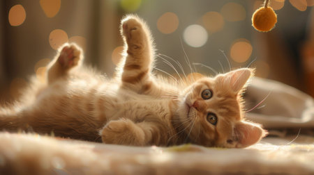 A cute kitten lying on its back, playfully swatting at a dangling toy, in a warm and cozy home.