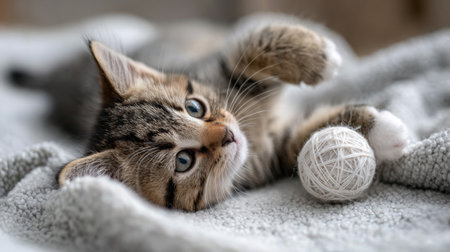 An adorable tabby kitten is playfully resting on a soft blanket while interacting with a yarn ball. This charming scene captures the joy and innocence of a cat
