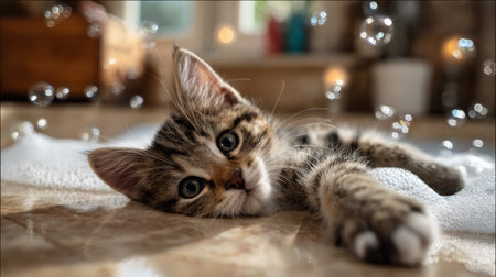 A charming kitten lies peacefully on a surface, gazing curiously with its big eyes while surrounded by playful floating bubbles in a cozy indoor environment.