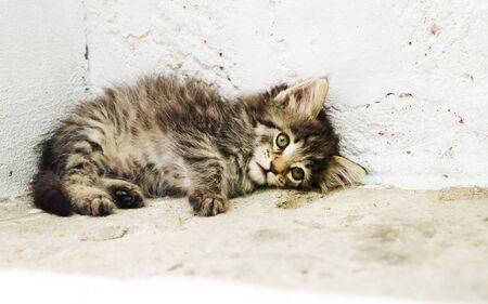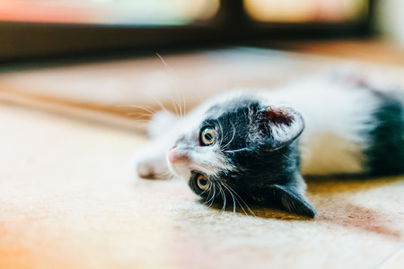 Cute tabby kitten lying on the floor and looking at camera