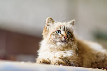Fluffy cat with blue eyes lying on the carpet and looking at the camera