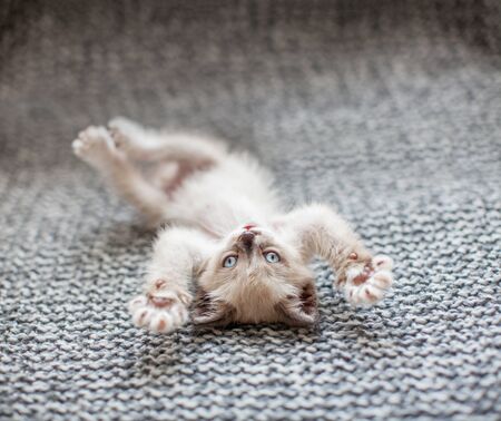 Kitten playing on a gray knitted blanket. Little cut cat at home
