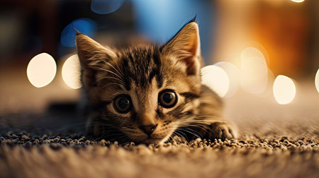 Cute little kitten on the carpet with bokeh background.