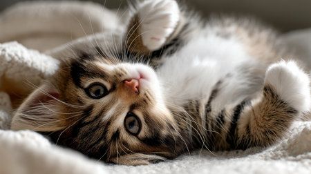 A playful tabby kitten lies on its back, curiously gazing at the viewer with wide eyes. Its soft fur and gentle demeanor make it an adorable sight, bringing joy and warmth.