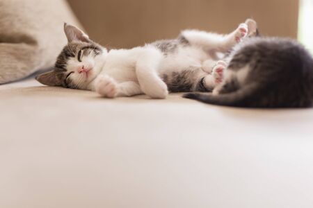 Two adorable little kittens sleeping on the living room sofa