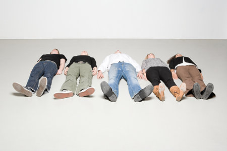 Top view of a group of friends lying on floor and looking at camera