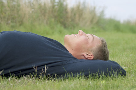 A young adult male sunbathing, laying on short grass on a warm summer's day