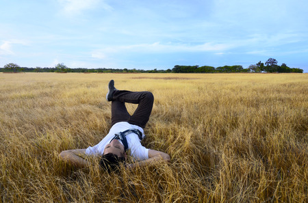 Young asian man relaxing on savanna at sumba island indonesia