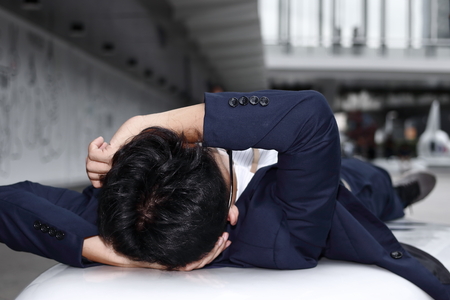 Tired depressed young Asian business man lying down and feeling stressful.