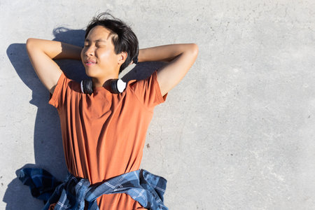 Outdoors, asian teenage boy wearing headphones and orange shirt enjoying sunlight, copy space. relaxation, outdoor, leisure, casual, enjoyment, listening