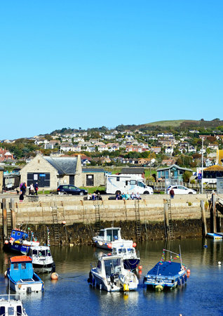 WEST BAY, UK - OCTOBER 10, 2022 - View of traditional fishing boats moored in the harbour at low tide with the town and countryside to the rear, West Bay, Dorset, UK, Europe, October, 2022.