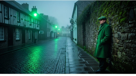 A cinematic, ultra-wide 16:9 environmental shot capturing the mood of a traditional Irish street dur