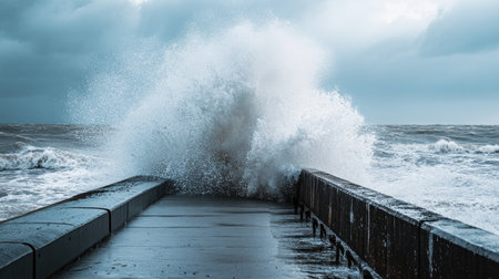 A powerful wave crashing against a seawall during a storm, with water spraying into the air.